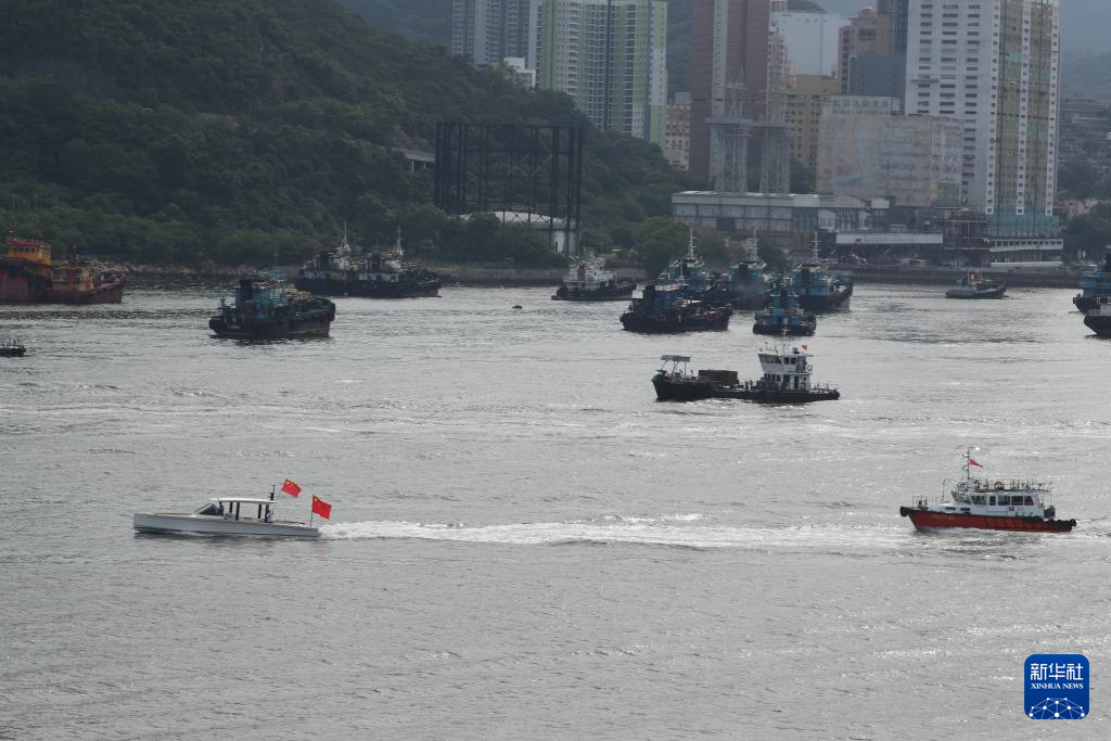 7月3日,中国海军山东舰航母编队抵达香港。这是民众驾驶民船随舰航行迎接航母编队。