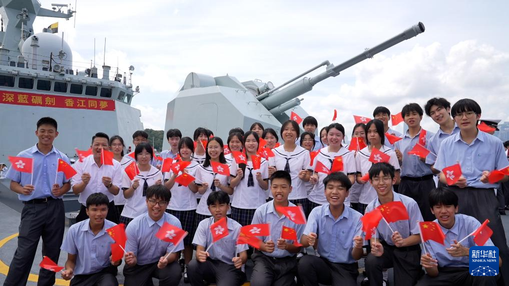 7月3日,中国海军山东舰航母编队抵达香港。这是香港中学生登上海军运城舰参观、留影。