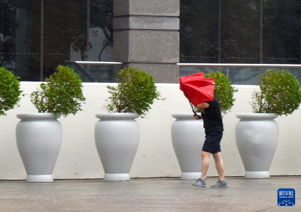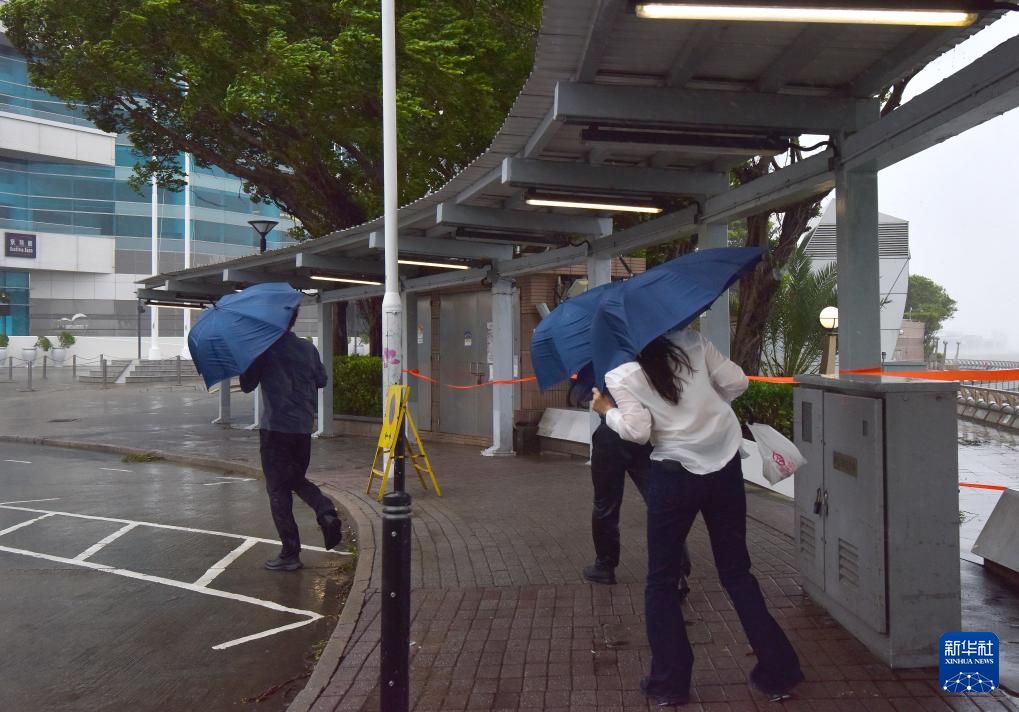 9月24日,在香港会展中心外,一名男子顶风前行。新华社记者 陈铎 摄