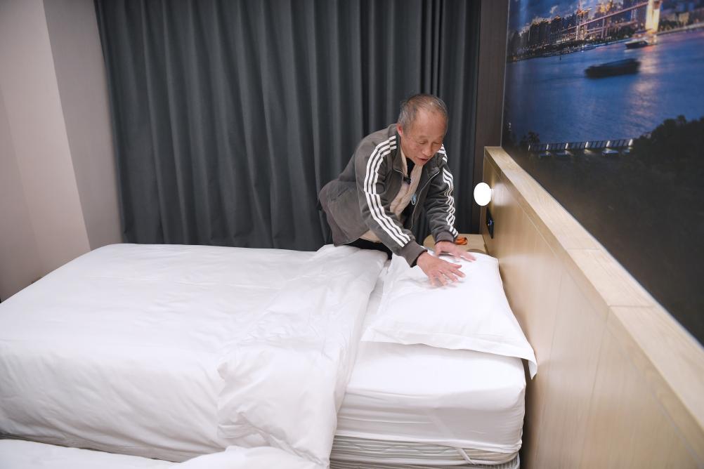 11月28日,宏福苑居民邝佩麟在粤海酒店“爱心客房”里整理床铺。新华社记者 陈铎 摄