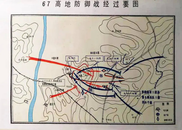 上午10时,敌人一个营的兵力在12辆坦克和3辆喷火坦克的支援下逼近我军阵地。一个排的敌人由67高地东北方向向我军发起冲击,我坚守部队猛烈抗击。此时,预备队3排7班迅速增援到位,很快打退了敌人两次反扑。