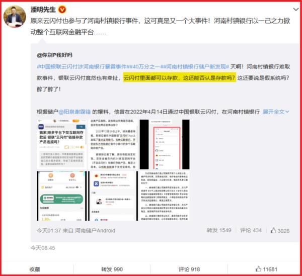 而且你新东方村镇银行赖得掉吗?已经有储户爆料,他曾在2022年4月14日通过中国银联云闪付,在河南村镇银行(开封新东方)存款,连咨询和程序截图都发了出来,现在这个标签已经上了热搜。