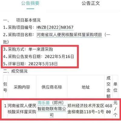 上海某保供单位,6天成立,符合流程;郑州某公司,成立10天,就中标了河南省“核酸采样屋”采购项目。