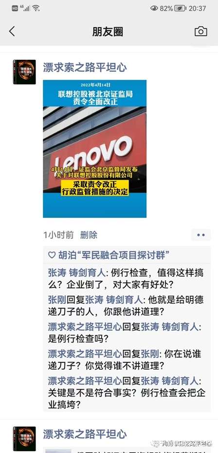 “例行检查,值得这样搞么?企业倒了,对大家有好处?”2022年4月14日,新华社内参室原主任杨兆波在微信上给我发来一段视频,是有关北京市证监局处罚联想控股违规、责令整改的内容。我随手把视频转发在朋友圈,没想到立即引来一条留言——不是别人,正是联想公关宣传部门原负责人、曾担任过柳传志七年秘书、著有《柳问》一书的张涛。