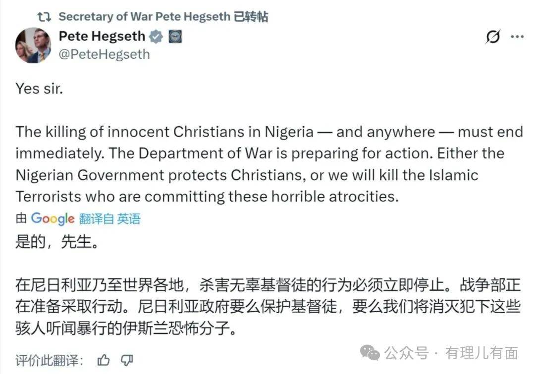 可是,尼日利亚总统的辩解并没有平息特朗普的怒气,看他与赫格塞斯的一唱一和,人们几乎可以预计,美国这次是真的打算动手了。