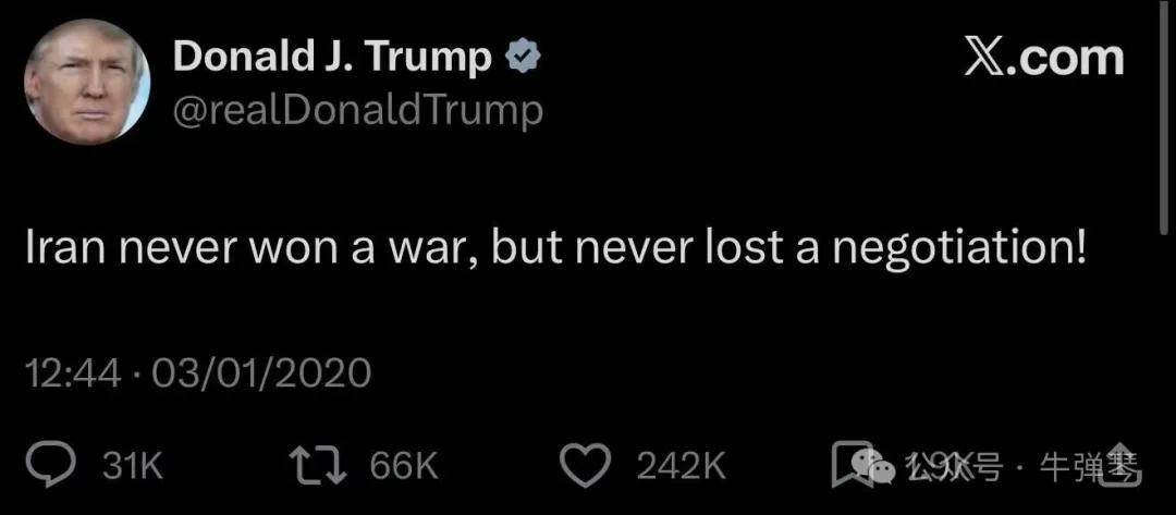 我看到,有网友翻出了2020年他的一条推文,上面写道:伊朗从来没赢得过一场战争,但从来没输掉过一场谈判!