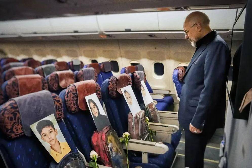 专机的第一排座位上,安静摆放着四个小女孩的照片,下面是她们的书包,每个书包旁边,还放着一支鲜花。