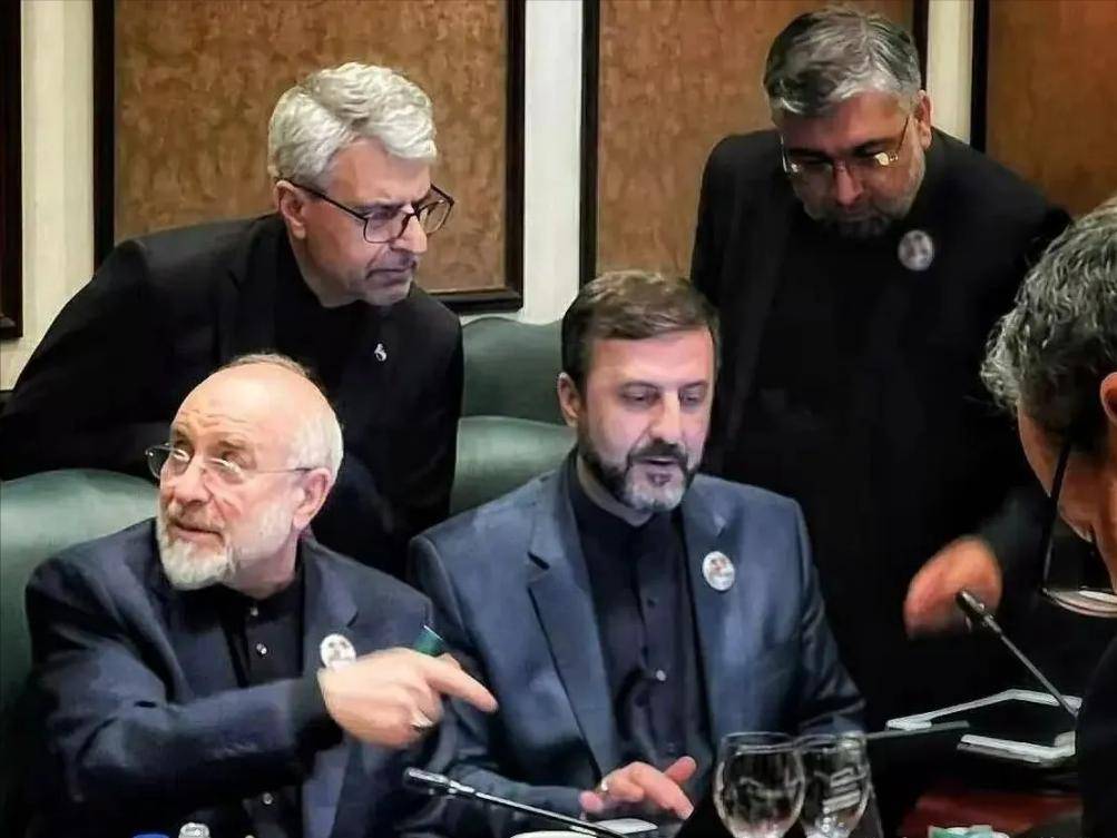 我看到,谈判桌前的卡利巴夫,还佩戴了一个特别的徽章,徽章中一个头像,就是开战第一天被美以炸死的伊朗最高领袖哈梅内伊。