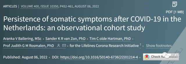 比如说,2022年8月6日,荷兰格罗宁根大学的Judith G M Rosmalen教授在国际顶尖医学期刊《柳叶刀》上发表了题为:Persistence of somatic symptoms after COVID-19 in the Netherlands: an observational cohort study 的研究论文。