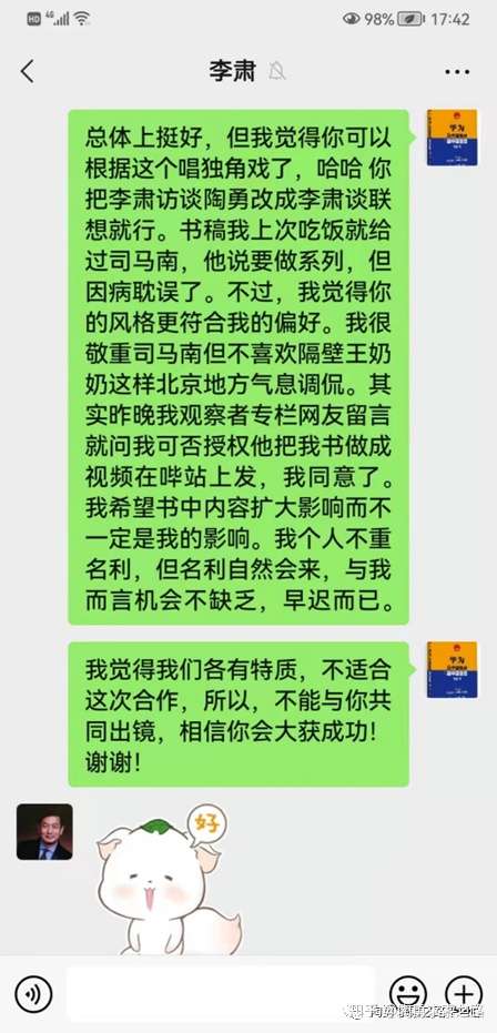 首先,牠说到我跟某人见面,这符合事实。但牠不知道的是,我跟某人这次见面后因为分歧根本没有合作,所谓“陶勇解读倪光南”系列,纯属肆无忌惮歪曲事实、自以为是的忽悠,跟本人完全没有关系,后面我会专门列出有力证据。