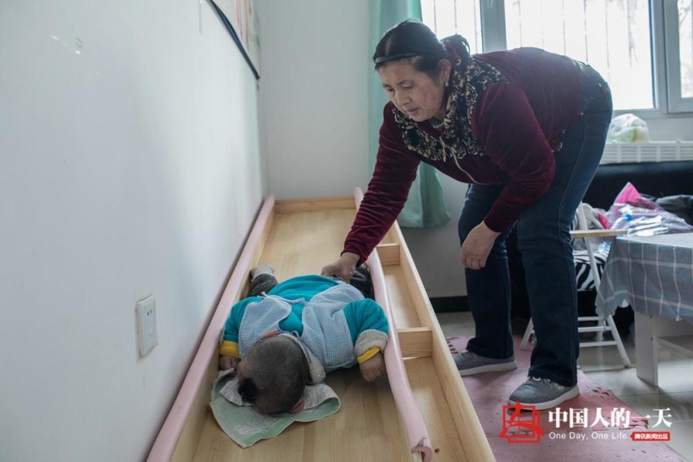 2016年8月3日晚,范连后还未下班回家,桂芳和婆婆照看宝宝。桂芳抱着哭闹的孩子,反复摔打了有十多次。婆婆见此情景想要上前阻挡,桂芳连婆婆一起打。等到桂芳回过神来,意识到把孩子摔伤,这才紧急将孩子送往医院。辗转了多家医院后,传恩被诊断为脑瘫、癫痫、失明,只能吃流食,身体也无法活动,需要长期康复治疗。图为奶奶给传恩做肢体康健运动,他每天要坚持三小时的爬行训练。