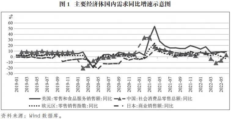 其一,以经济外循环为主的发展模式亟待转型。美欧日三大市场近十亿人口的消费需求对中国制造业的崛起发挥了重要作用,但时至今日,无论是从相对体量还是从国际政治环境来看,这种为西方国家五亿多中产阶级而生产的发展模式已经不可持续。事实上,中国政府已经意识到这一问题,提出要构建以国内大循环为主体、国内国际双循环相互促进的新发展格局。然而,2021年以来,本土消费市场规模增速持续落后(如图1所示),为中国居民提供更多可支配收入以提振内需是必要且紧迫的。