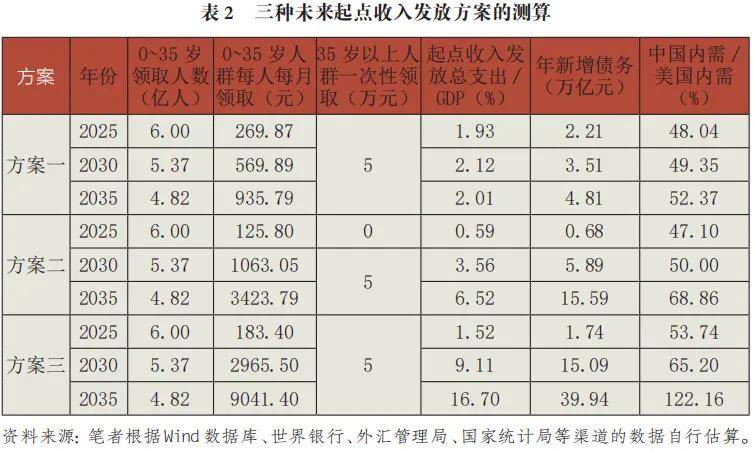 方案二:假设从2025年起到2035年,中国社会支出水平占GDP的比例匀速上涨到OECD国家2019年的整体水平(20.03%),扣除养老金增量外,增量部分的50%用于发放未来起点收入。考虑到2025年可用于发放起点收入的资金有限,故教育补贴自2026年起发放。