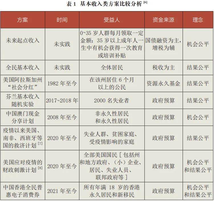 本文将未来起点收入方案与全民基本收入以及现有的类似基本收入的实践进行对比,具体内容如表1所示。