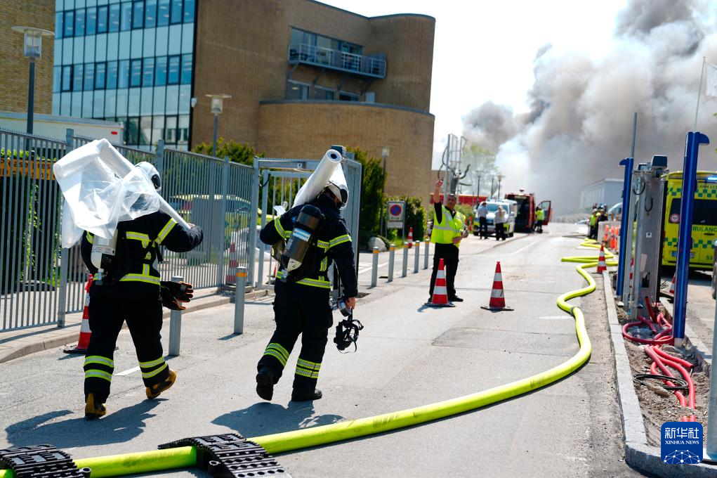 5月22日,在丹麦鲍斯韦市,消防员在火灾现场附近工作。新华社/美联