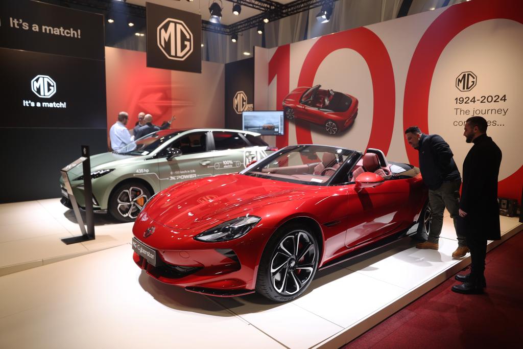 1月17日,人们在比利时布鲁塞尔举办的2024布鲁塞尔汽车展上参观上汽名爵电动汽车。新华社记者赵丁喆摄