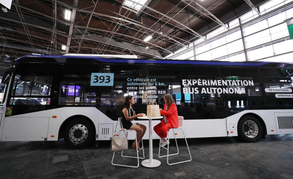 2022年6月15日,在法国巴黎凡尔赛门展览中心举行的VivaTech科技创新展览会上,巴黎大众运输公司展示393号线路自动驾驶客车,该车由中国中车旗下中车时代电动汽车股份有限公司制造。新华社记者高静摄