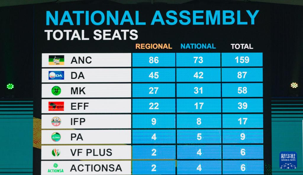 南非独立选举委员会2日正式公布2024年大选计票结果,执政党非洲人国民大会在议会选举中获得国民议会(议会下院)400个议席中的159席。