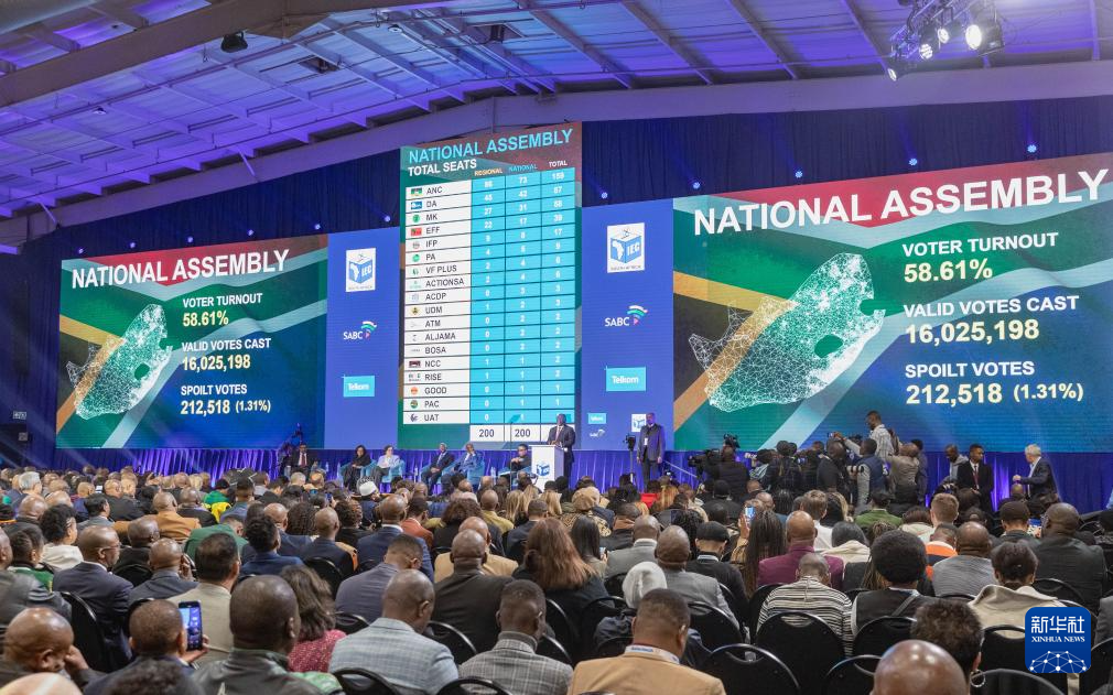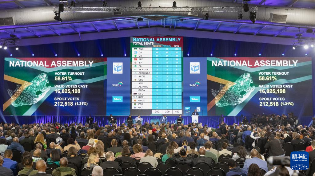 6月2日,在南非米德兰的大选计票中心,电子显示屏显示南非大选最终计票结果。