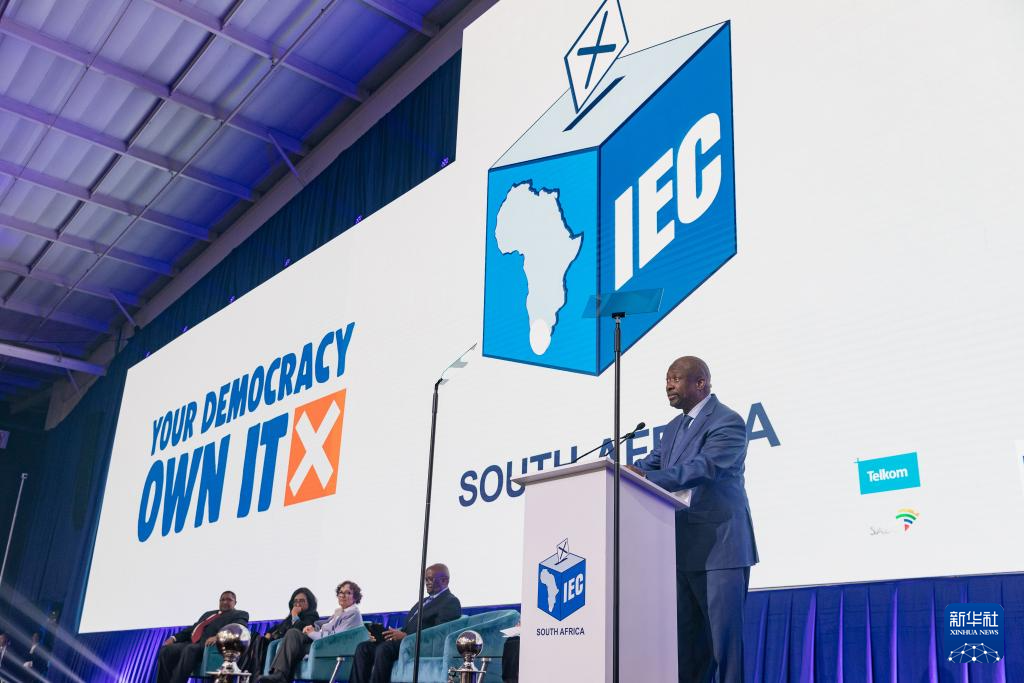 6月2日,在南非米德兰的大选计票中心,南非独立选举委员会召开新闻发布会宣布选举结果。