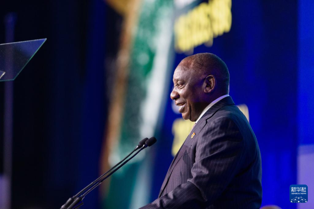 6月2日,在南非米德兰的大选计票中心,南非总统拉马福萨在记者会上发言。