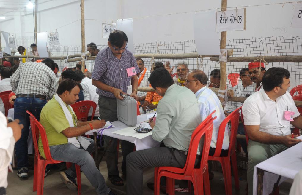 6月4日,在印度勒克瑙,选举工作人员进行计票。新华社/印度联合新闻社