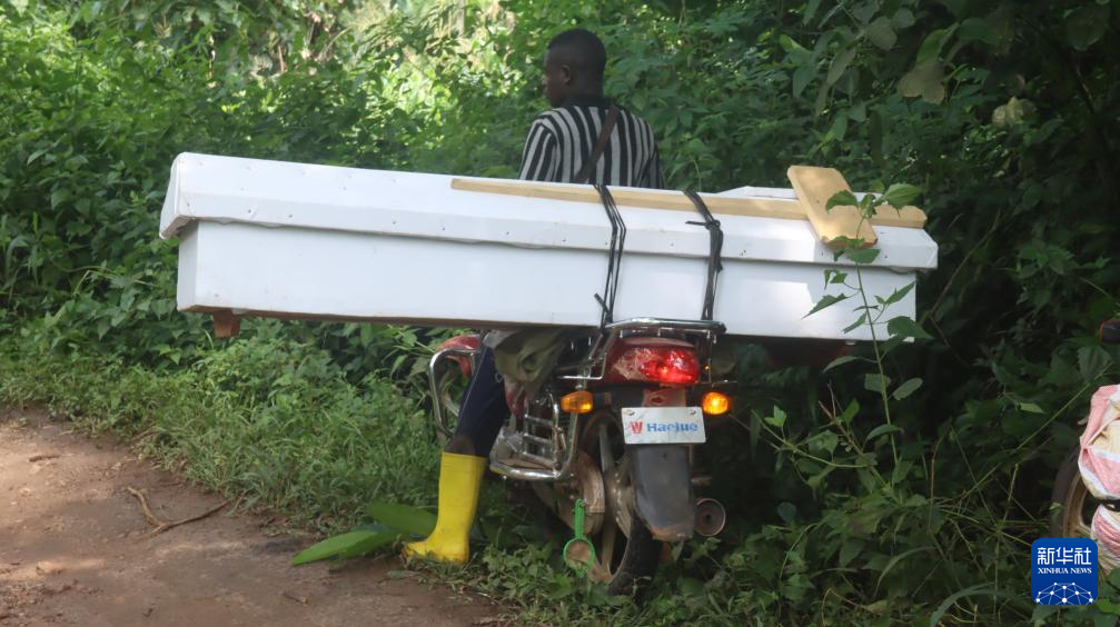 6月11日,在刚果(金)东部北基伍省贝尼地区,一名当地居民用摩托车运送棺材。