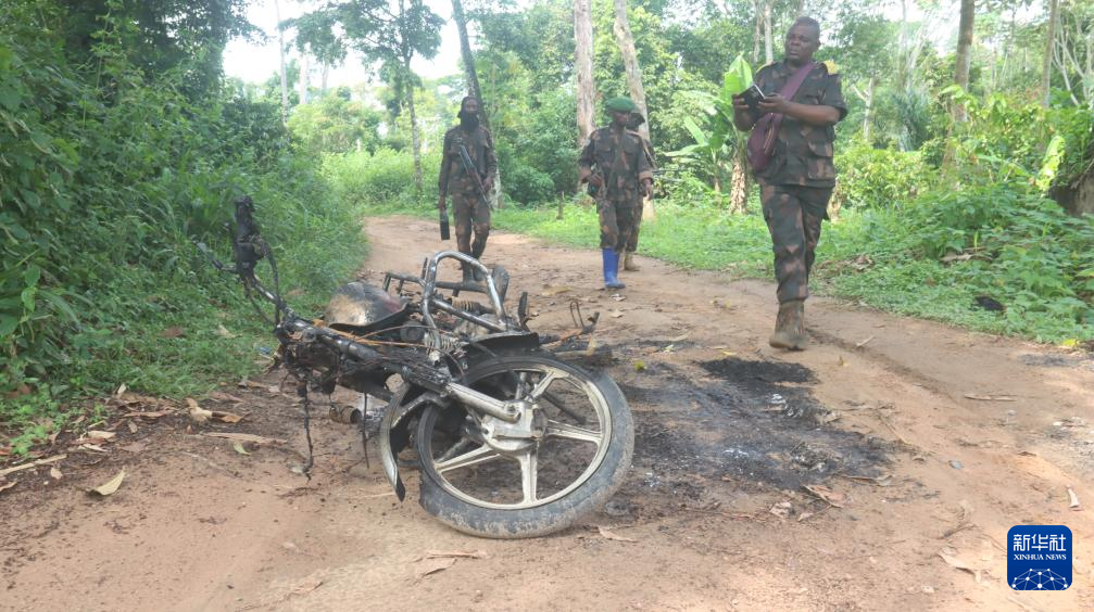 6月11日,在刚果(金)东部北基伍省贝尼地区,刚果(金)士兵巡逻时经过一辆被毁的摩托车。