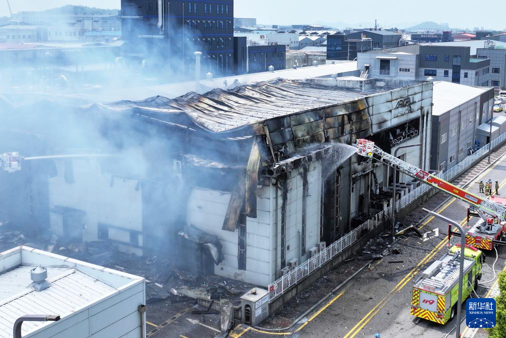 6月24日,消防员在韩国京畿道华城市的电池工厂火灾现场工作。新华社/美联