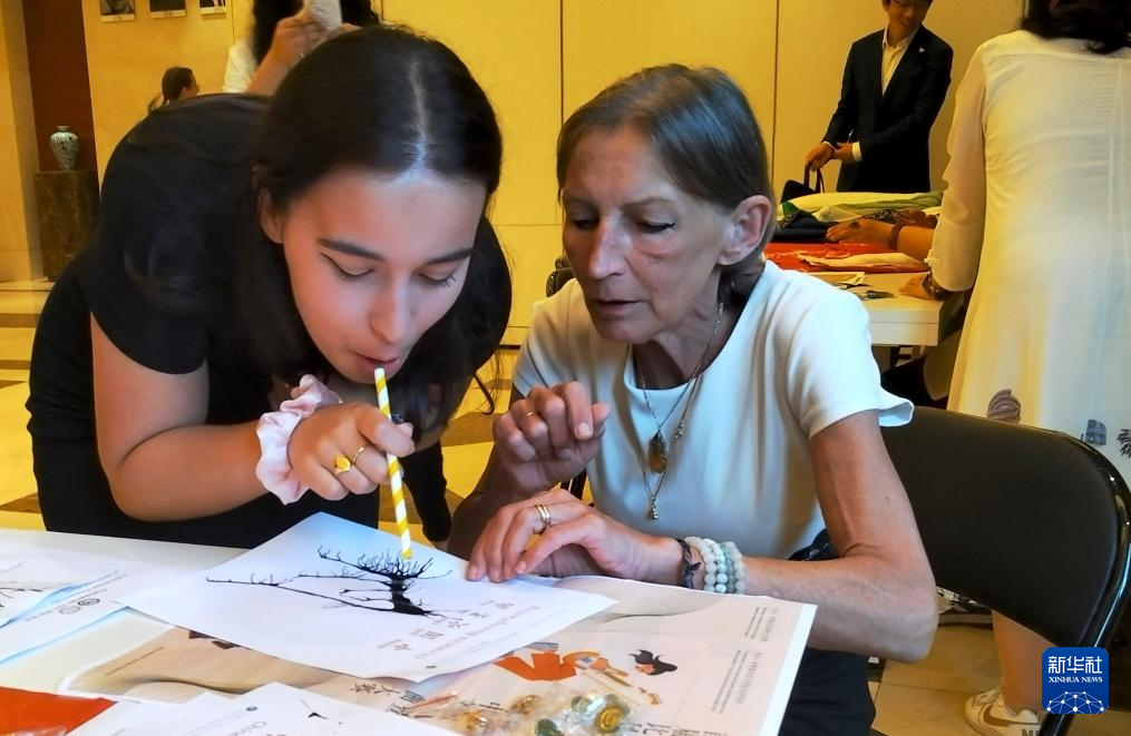 6月26日,在比利时布鲁塞尔,人们参加吹墨画体验活动。新华社记者 潘革平 摄
