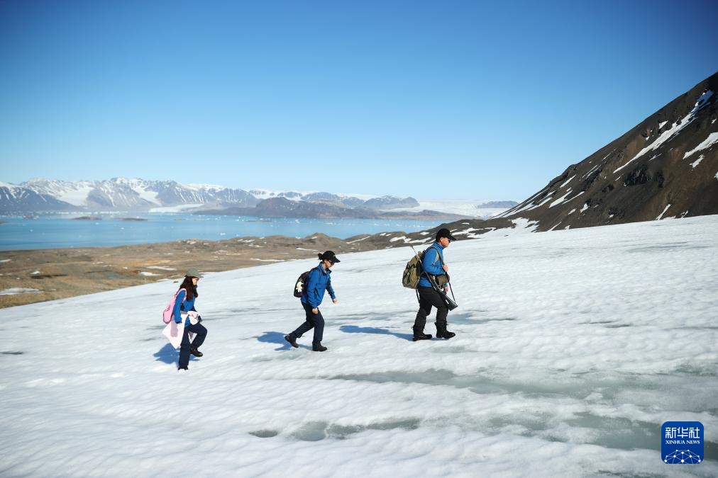 6月22日,在挪威斯瓦尔巴群岛,中国科考队员徒步前往东洛文冰川采样点。