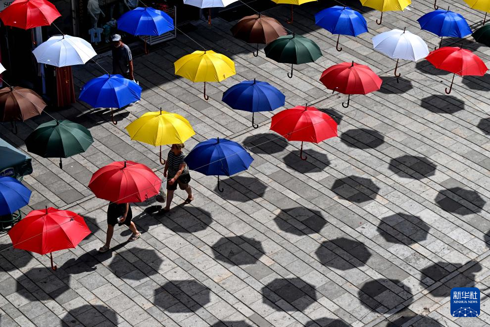 6月22日,在北马其顿的斯特鲁加,人们走在用彩色遮阳伞装点的街道上。
