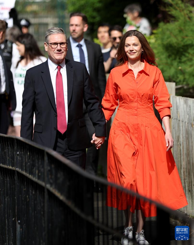 7月4日,在英国伦敦,英国工党领袖基尔·斯塔默(前左)与妻子前往一处投票站,准备投票。新华社记者 李颖 摄