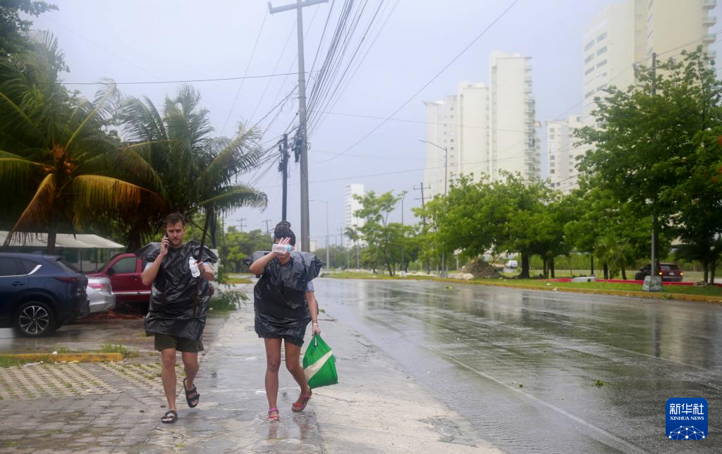 7月5日,在墨西哥东南部金塔纳罗奥州坎昆,人们在雨中行走。新华社发(阿尔韦托·巴尔德斯摄)