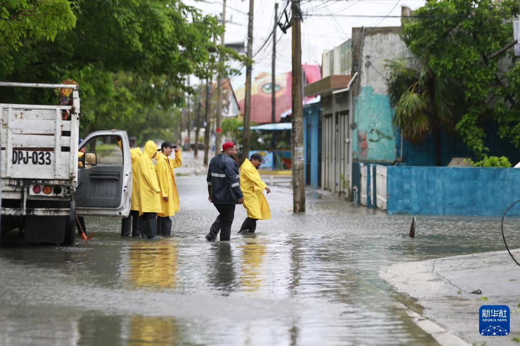 7月5日,在墨西哥东南部金塔纳罗奥州坎昆,人们查看路面积水情况。新华社发(阿尔韦托·巴尔德斯摄)