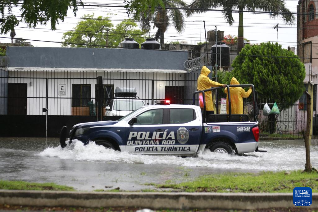 7月5日,在墨西哥东南部金塔纳罗奥州坎昆,警车驶过积水的道路。新华社发(阿尔韦托·巴尔德斯摄)