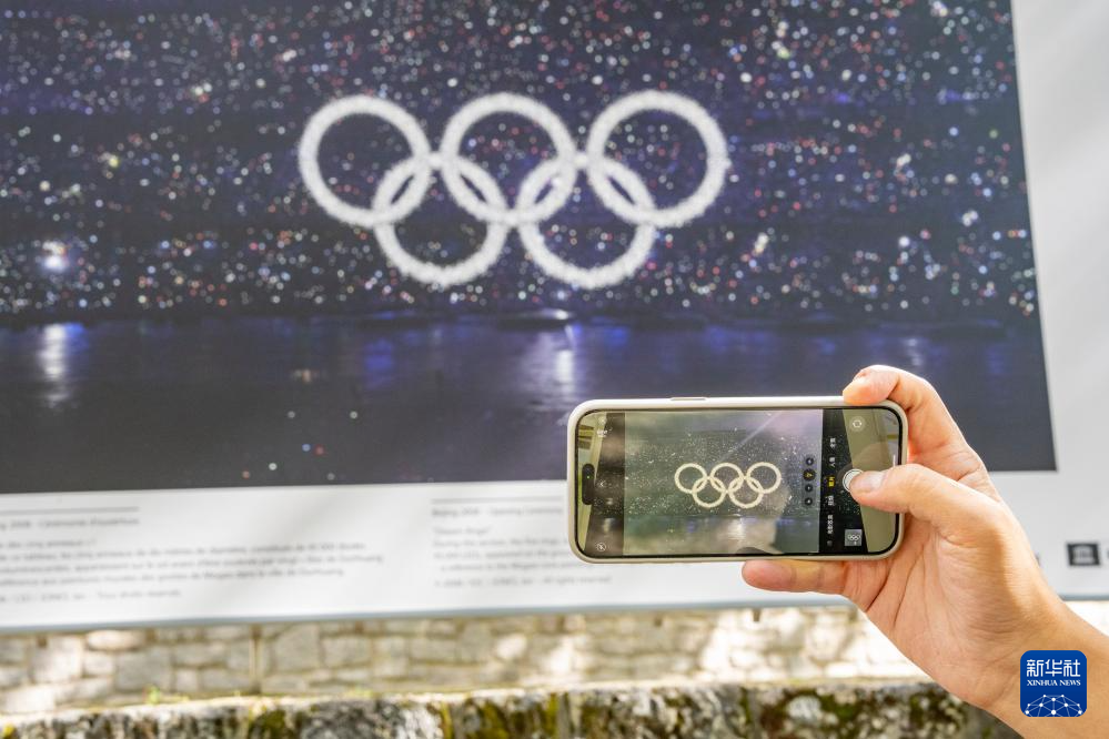7月6日,一名参观者用手机拍摄联合国教科文组织展出的北京奥运会开幕式照片。
