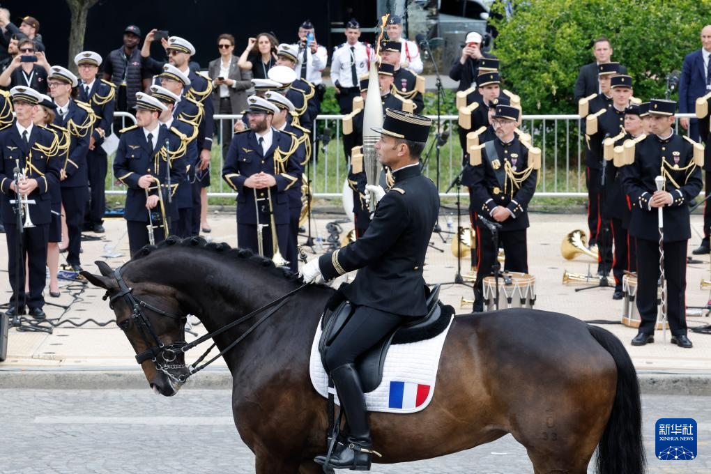 7月14日,在巴黎举行的法国国庆阅兵仪式上,2016年里约奥运会马术团体障碍赛冠军得主瓦莱特展示奥运火炬。