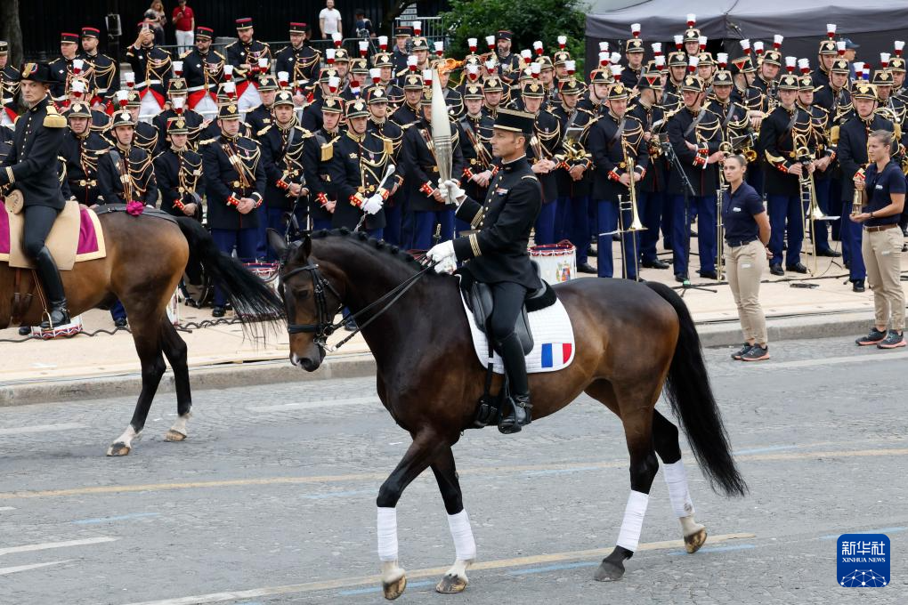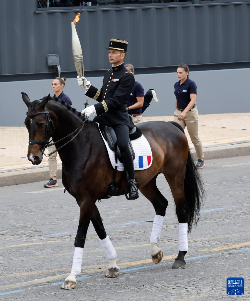 7月14日,在巴黎举行的法国国庆阅兵仪式上,2016年里约奥运会马术团体障碍赛冠军得主瓦莱特(前)展示奥运火炬。