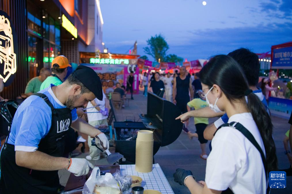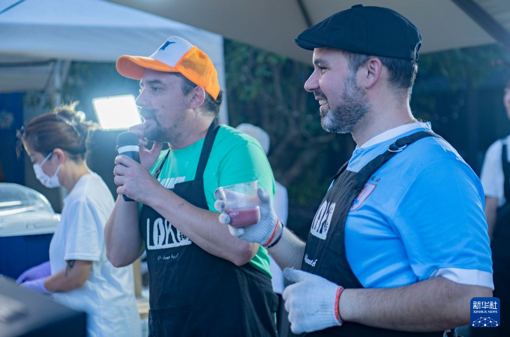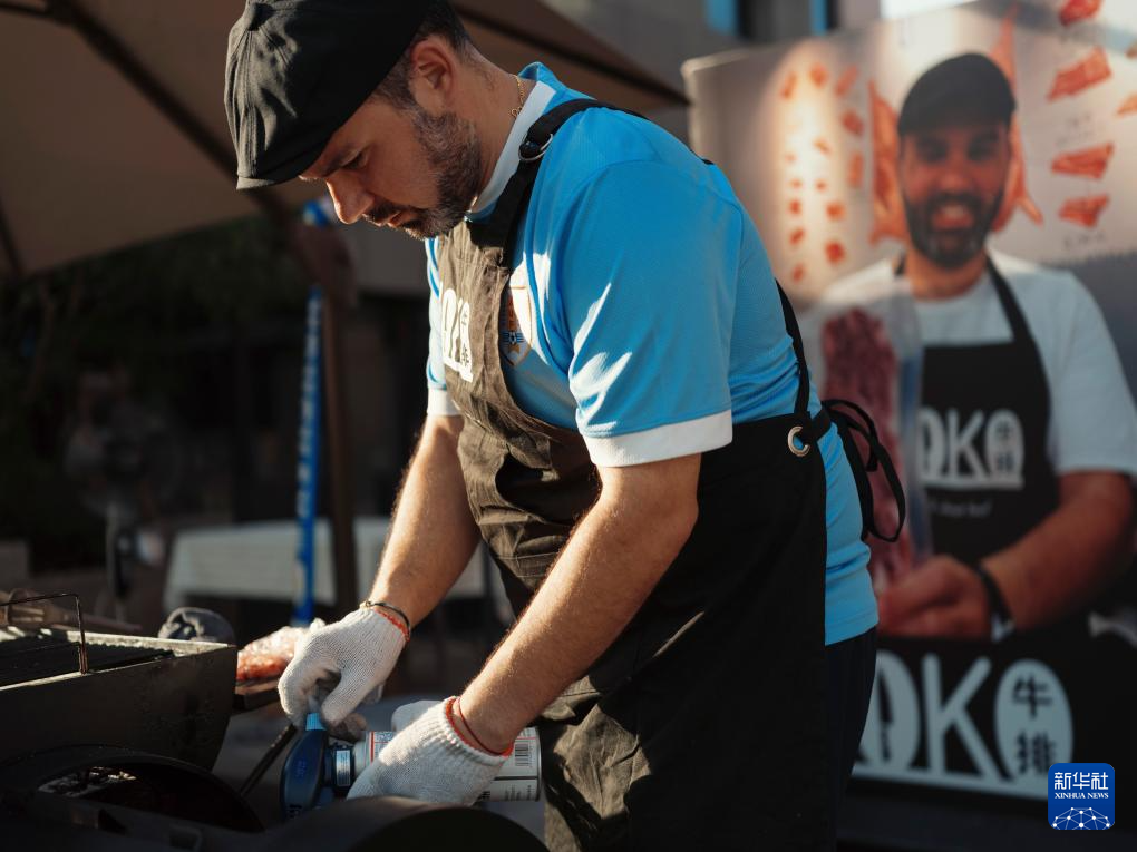 7月19日,在芜湖古城,马丁(左一)在当天举行的啤酒节上制作牛排。
