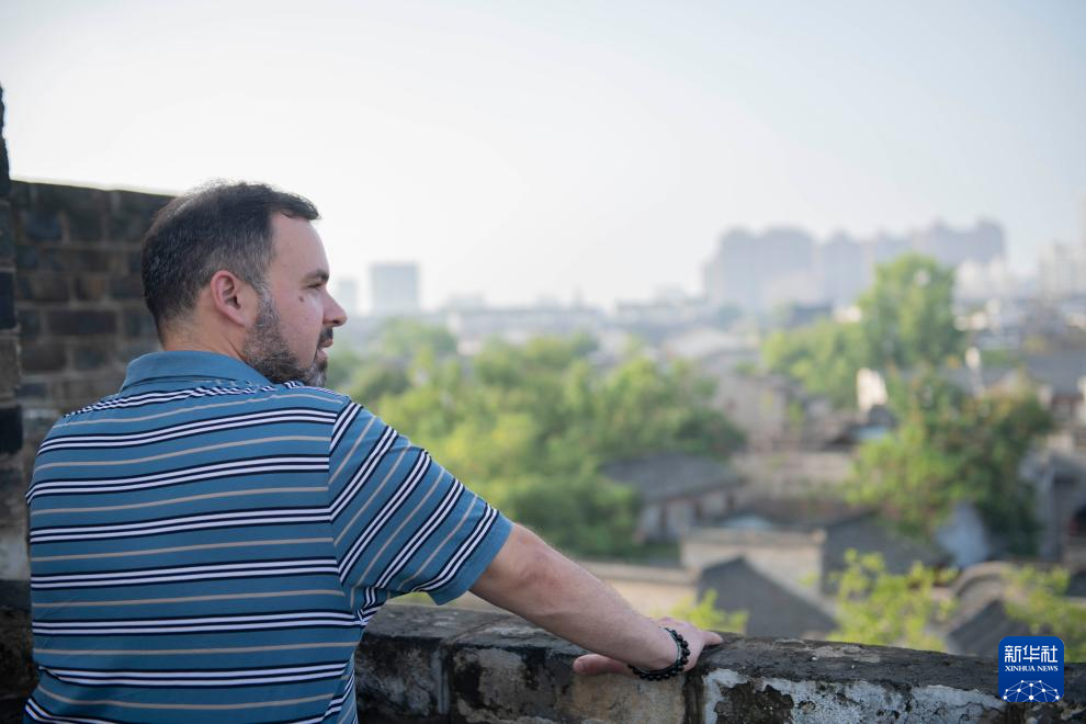 6月20日,在芜湖古城,马丁在长虹门城楼上欣赏风景。