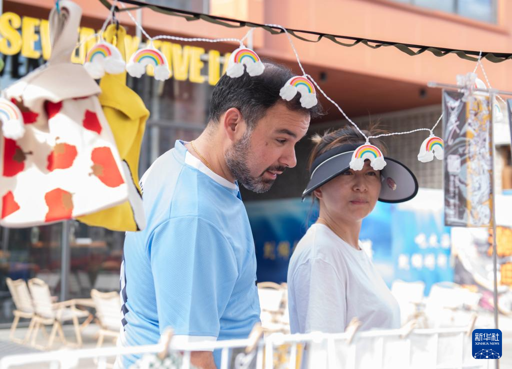 7月19日,在芜湖古城,马丁(左)和妻子张进逛文创商品摊。
