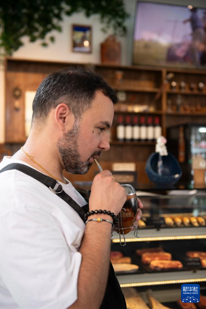 6月20日,在芜湖古城的LOKO牛排馆,马丁展示他从乌拉圭带来的马黛茶茶具。