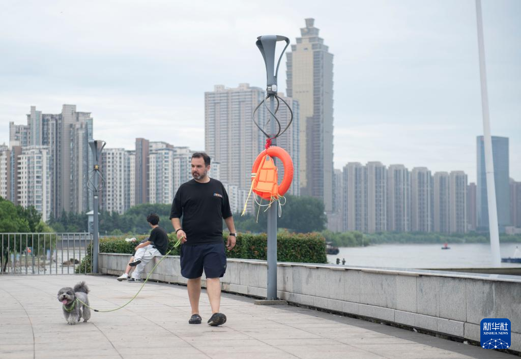 7月20日,在安徽芜湖市,马丁在长江边遛狗。