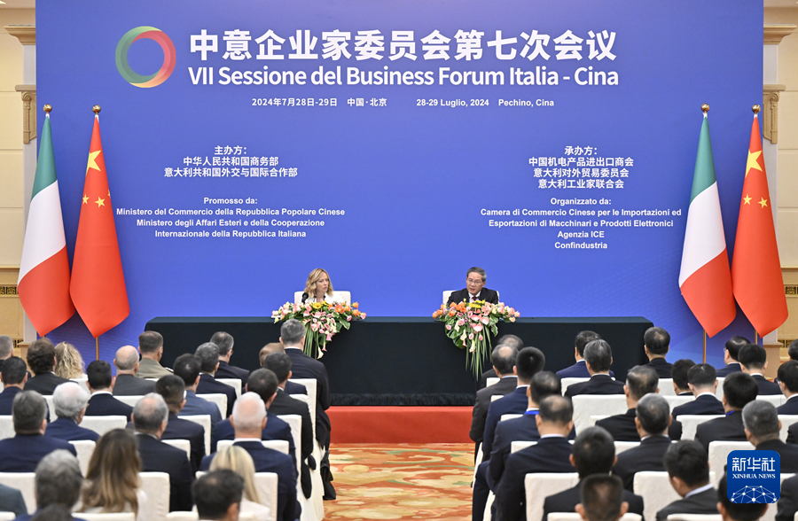 7月28日下午,国务院总理李强在北京人民大会堂同意大利总理梅洛尼共同出席中意企业家委员会第七次会议开幕式并致辞。新华社记者 岳月伟 摄