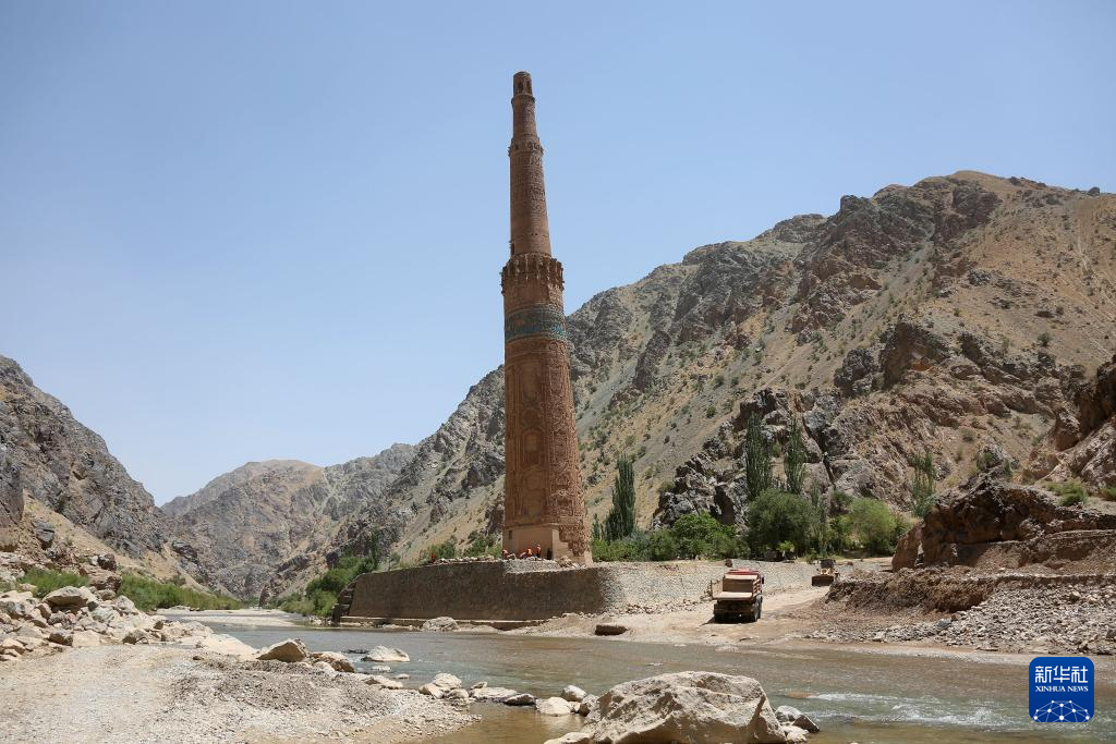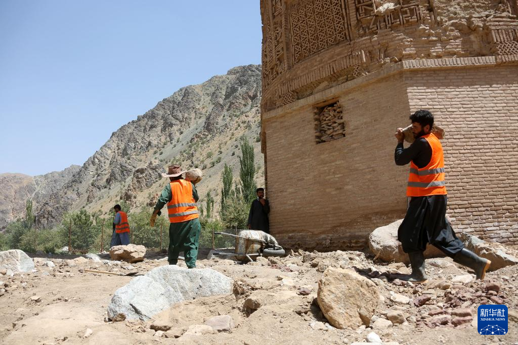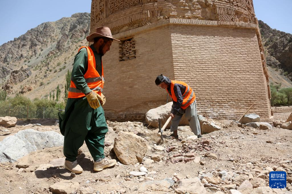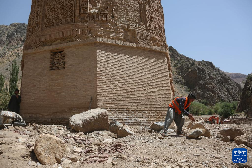 今年5月以来,阿富汗古尔省遭遇洪涝灾害,山洪越过贾姆宣礼塔周边的保护墙,淹没了塔底。当地工人通过加固保护墙等措施保护该文化遗址。