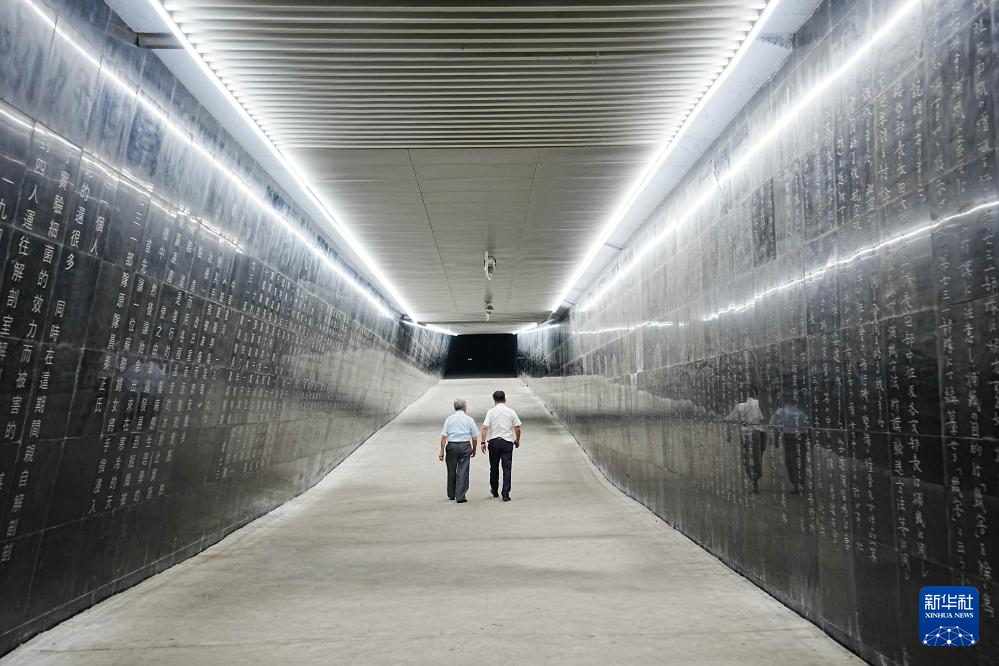 8月13日,清水英男(左)走过侵华日军第七三一部队罪证陈列馆的“证言墙”通道。