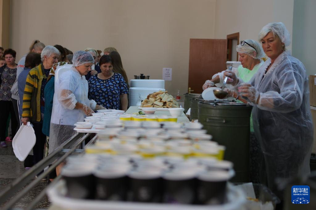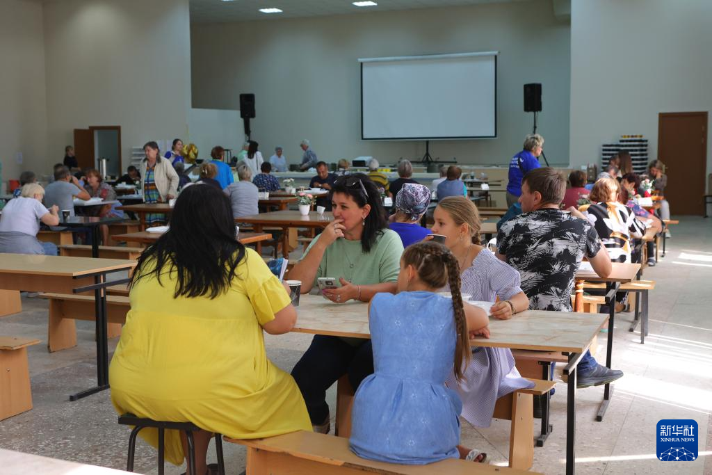 8月14日,来自俄乌边境地区的居民在俄罗斯别尔哥罗德州旧奥斯科尔的一处临时安置点内就餐。