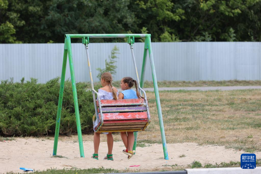 8月14日,孩子们在俄罗斯别尔哥罗德州旧奥斯科尔的一处临时安置点内荡秋千。