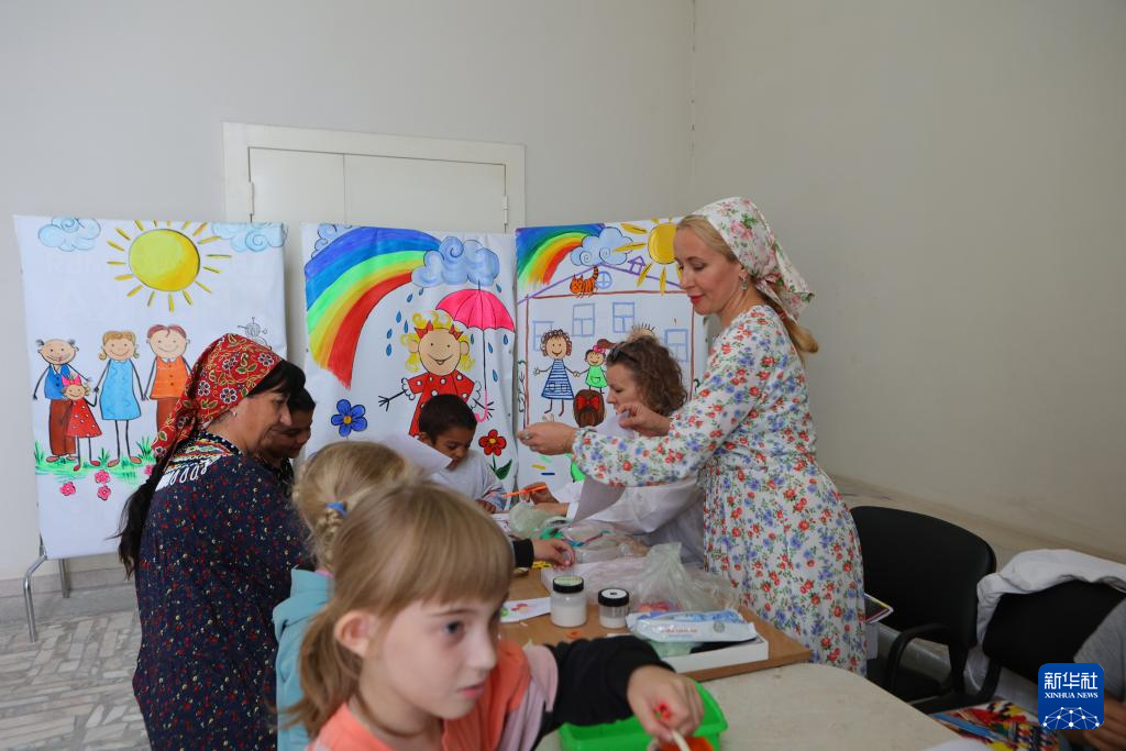 8月14日,孩子们在俄罗斯别尔哥罗德州旧奥斯科尔的一处临时安置点内绘画。